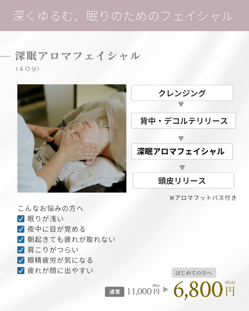 アロマの心地よい香りは生理時の不快感や憂うつな気分を解消することができますので、無理のない範囲でお越しくださいませ。